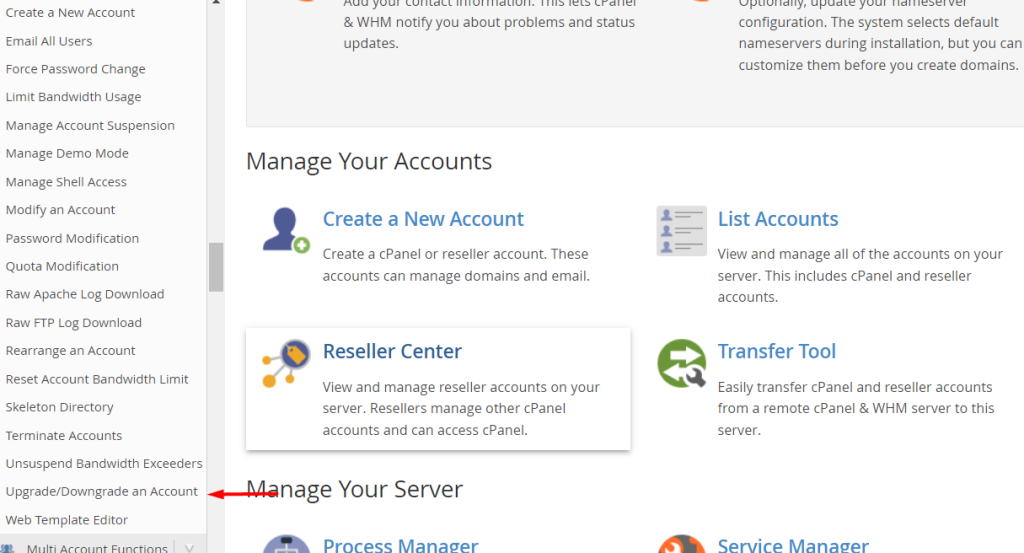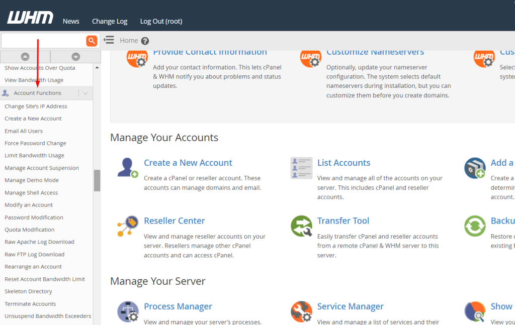 Navigate to Account Functions: Look for the “Account Functions” section in WHM.