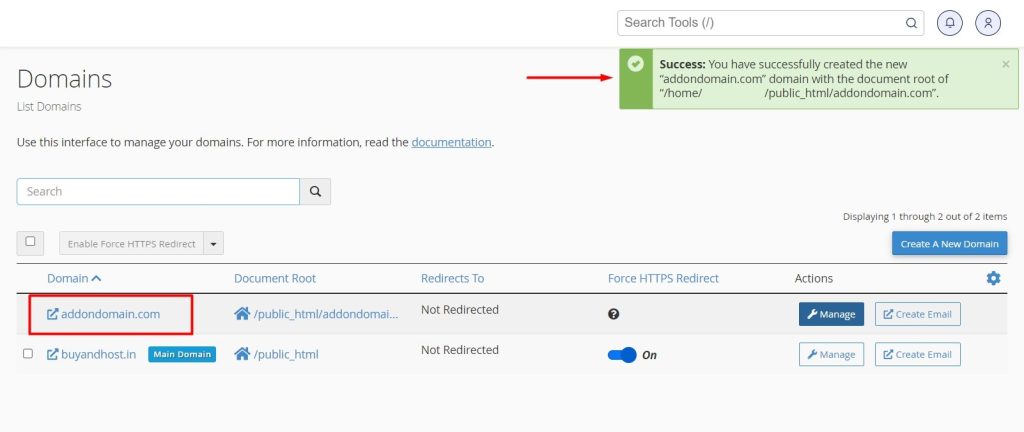 cPanel will display a confirmation message indicating that the add-on domain has been created.