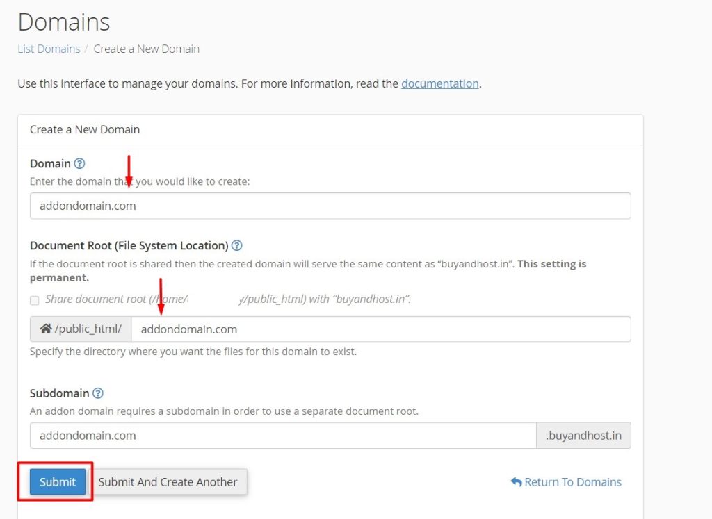 Document Root: This is the directory where the files for the new domain will be stored. It’s usually filled automatically based on the new domain but can be adjusted if necessary.